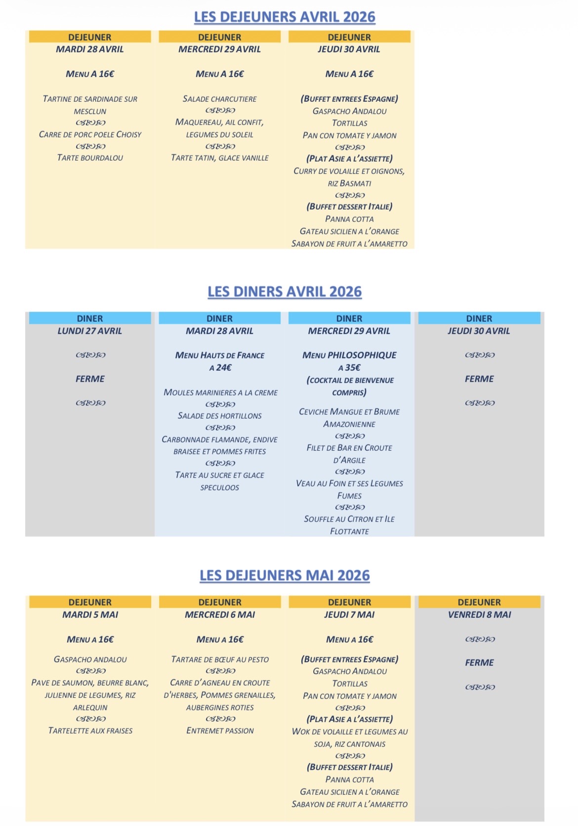 DEJEUNERS DINERS AVRIL DEJEUNERS MAI